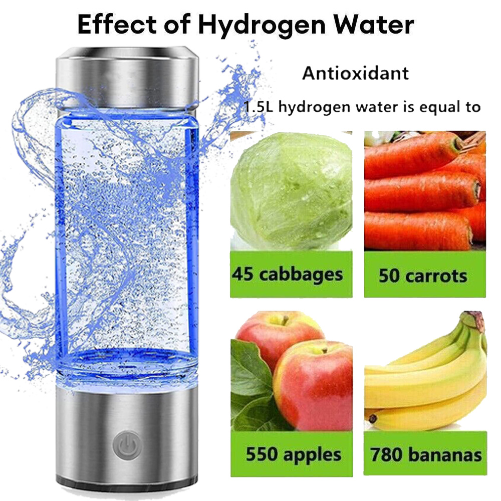 Unlock the secret to superior hydration with our Hydrogen Water Bottle, your personal fountain of antioxidants. Just 1.5 liters of hydrogen-infused water from our bottle is equivalent to the antioxidant power of an astounding 550 apples or 780 bananas. Imagine sipping your way to health with the nutritional benefits of 45 cabbages or 50 carrots, without the hassle of daily juicing. Our advanced hydrogen water bottle technology delivers a powerful punch of antioxidants, helping to combat free radicals and promote cellular health. Whether you're at home, in the office, or on the go, enhance your daily water intake with the revitalizing effects of hydrogen water. Choose our Hydrogen Water Bottle for a daily boost of wellness that your body will thank you for.